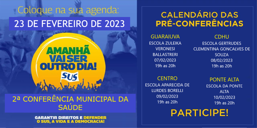 O Departamento Municipal de Saúde e o Conselho Municipal de Saúde irão realizar no dia 23 de fevereiro a 2° Conferência de Saúde Municipal de Vargem. A temática da etapa municipal segue a mesma que das Conferências Estadual e Nacional, que é Garantir direitos e defender o SUS, a vida e a democracia, amanhã vai ser outro dia.