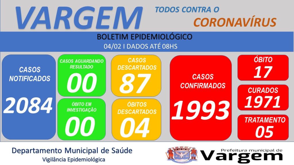 Vigilância Epidemiológica da Prefeitura Municipal de Vargem confirmou no dia de hoje (04/02/2023), 03 (três) casos CONFIRMADOS de coronavírus no município.