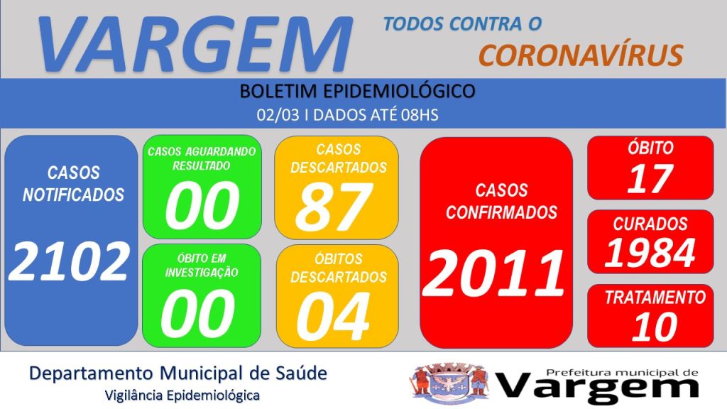Vigilância Epidemiológica da Prefeitura Municipal de Vargem confirmou no dia de hoje (02/03/2023), 06 (seis) casos CONFIRMADOS e 03 (três) casos CURADOS de coronavírus no município.