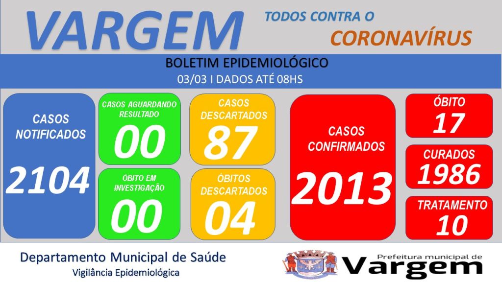 Vigilância Epidemiológica da Prefeitura Municipal de Vargem confirmou no dia de hoje (03/03/2023), 02 (dois) casos CONFIRMADOS e 02 (dois) casos CURADOS de coronavírus no município.