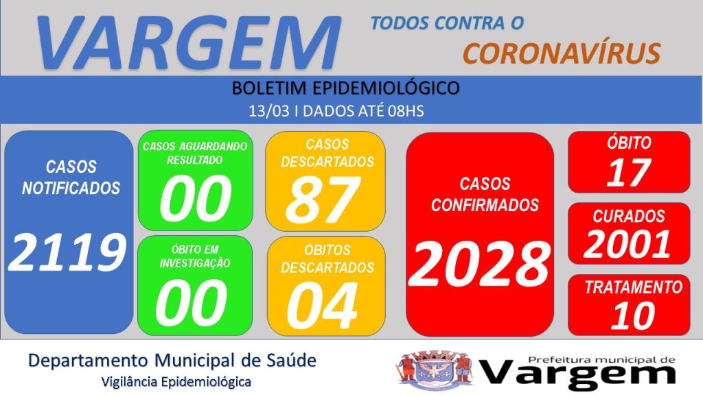 Vigilância Epidemiológica da Prefeitura Municipal de Vargem confirmou no dia de hoje (13/03/2023), 03 (três) casos CONFIRMADOS e 04 (quatro) casos CURADOS de coronavírus no município.