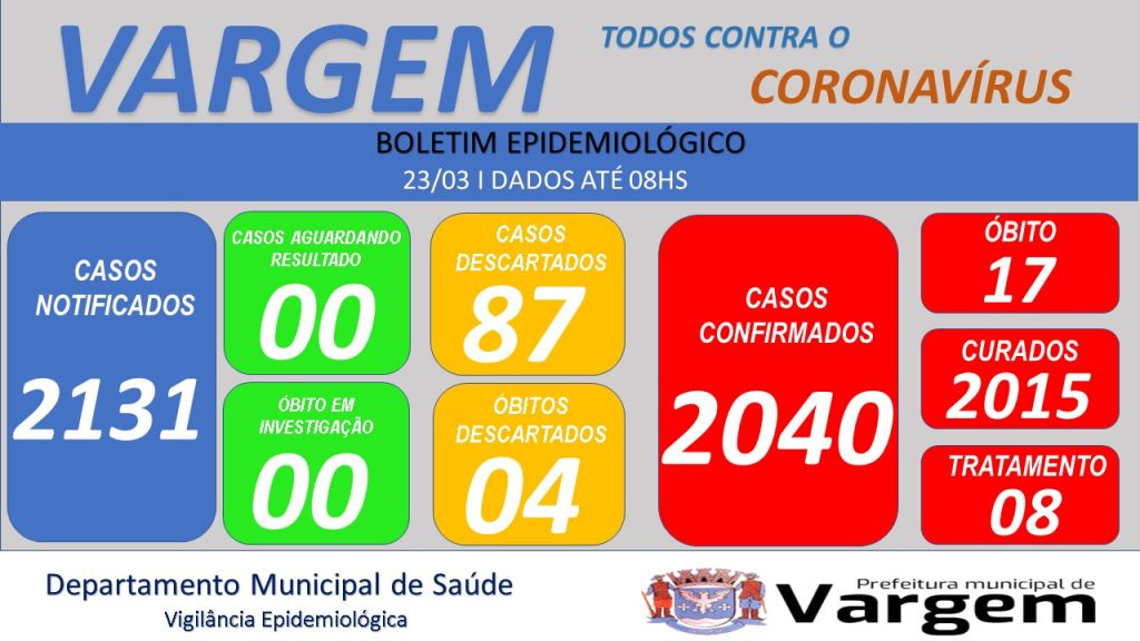 Vigilância Epidemiológica da Prefeitura Municipal de Vargem confirmou no dia de hoje (23/03/2023), 01 (um) caso CONFIRMADO e 01 (um) caso CURADO de coronavírus no município.