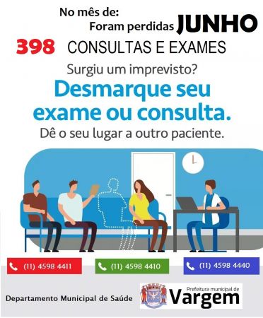 No mês de Junho foram perdidas 398 vagas de consultas e exames no municipio, vagas que poderiam ser redestribuidas com o cancelamento previo dos pacientes no setor de agendamento.