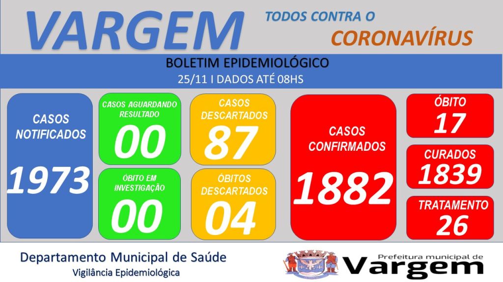 Vigilância Epidemiológica da Prefeitura Municipal de Vargem confirmou no dia de hoje (25/11/2022), 02 (dois) casos CONFIRMADOS e 09 (nove) casos CURADOS de coronavírus no município.