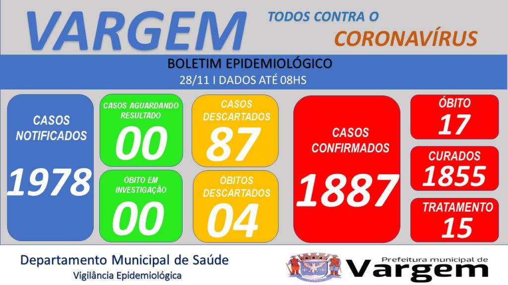 Vigilância Epidemiológica da Prefeitura Municipal de Vargem confirmou no dia de hoje (28/11/2022), 05 (cinco) casos CONFIRMADOS e 16 (dezesseis) casos CURADOS de coronavírus no município.