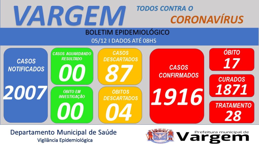 Vigilância Epidemiológica da Prefeitura Municipal de Vargem confirmou no dia de hoje (05/12/2022), 04 (quatro) casos CONFIRMADOS e 02 (dois) casos CURADOS de coronavírus no município.