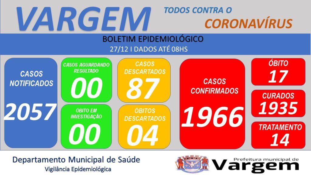 Vigilância Epidemiológica da Prefeitura Municipal de Vargem confirmou no dia de hoje (27/12/2022), 03 (três) casos CONFIRMADOS e 04 (quatro) casos CURADOS de coronavírus no município.