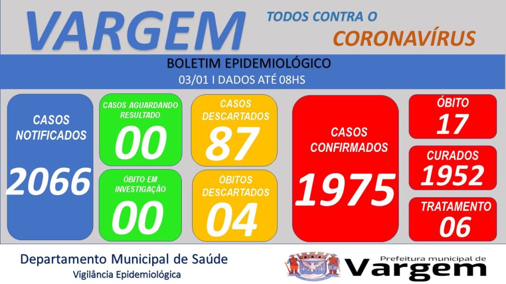 Vigilância Epidemiológica da Prefeitura Municipal de Vargem confirmou no dia de hoje (03/01/2023), 02 (dois) casos CONFIRMADOS de coronavírus no município.