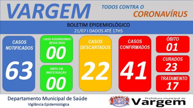 A Vigilância Epidemiológica da Prefeitura Municipal de Vargem confirmou no dia de hoje (21/07/2020), 03 (três) novos casos de coronavírus no município e 04 (quatro) pacientes CURADOS.