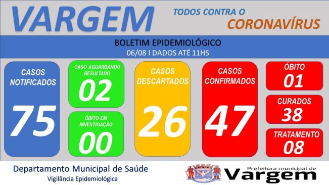 A Vigilância Epidemiológica da Prefeitura Municipal de Vargem confirmou no dia de hoje (06/08/2020), 01 (um) novo caso CONFIRMADO de coronavírus no município.