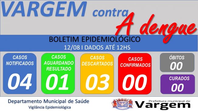 A Vigilância Epidemiológica da Prefeitura Municipal de Vargem confirmou no dia de hoje (12/08/2020), 01 (UM) paciente DESCARTADO de dengue no município.
