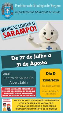 NO SÁBADO DIA 22/08/2020 DAS 08:00h AS 17:00h NO CENTRO SAÚDE DR ALBERT SABIN HAVERA CAMPANHA DE VACINAÇÃO DE SARAMPO COM PUBLICO ALVO: