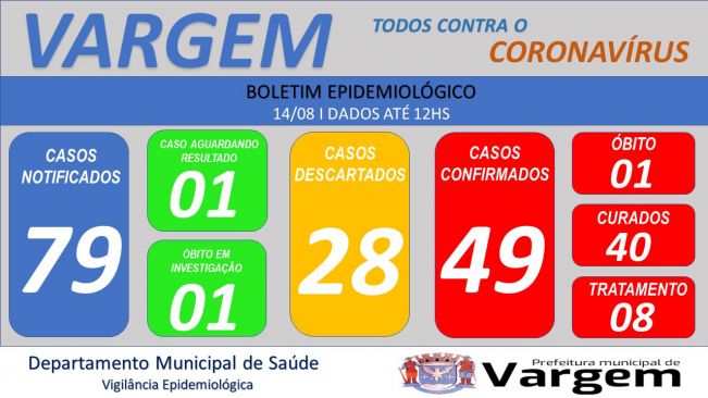 A Vigilância Epidemiológica da Prefeitura Municipal de Vargem confirmou no dia de hoje (14/08/2020), 01 (UM) paciente CONFIRMADO, 02 (DOIS) pacientes DESCARTADOS e 01 (UM) novo caso SUSPEITO de coronavírus no município.