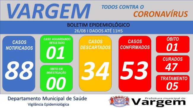 Vigilância Epidemiológica da Prefeitura Municipal de Vargem confirmou no dia de hoje (26/08/2020), 01 (um) caso CONFIRMADO e 01 (um) caso DESCARTADO de coronavírus no município.