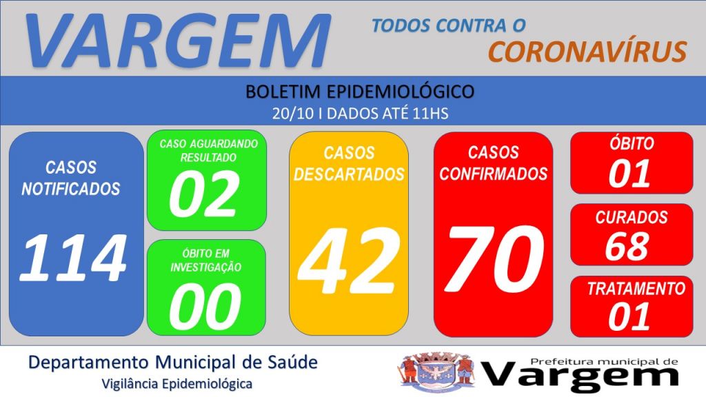A Vigilância Epidemiológica da Prefeitura Municipal de Vargem confirmou no dia de hoje (20/10/2020), 01 (um) caso CONFIRMADO, 02 (dois) casos SUSPEITOS e 02 (dois) casos CURADOS de coronavírus no município.