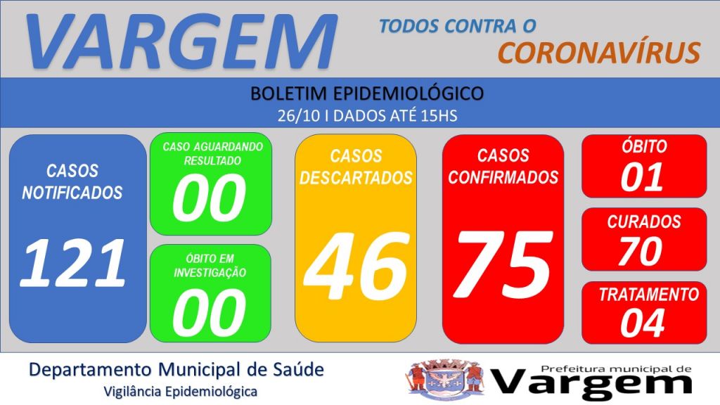 A Vigilância Epidemiológica da Prefeitura Municipal de Vargem confirmou no dia de hoje (26/10/2020), 01 (um) caso DESCARTADO e 02 (dois) casos CURADOS de coronavírus no município.