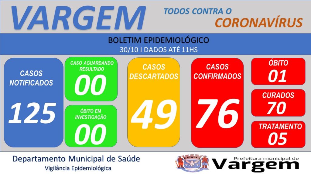 A Vigilância Epidemiológica da Prefeitura Municipal de Vargem confirmou no dia de hoje (30/10/2020), 01 (um) caso CONFIRMADO e 03 (três) casos DESCARTADOS de coronavírus no município.