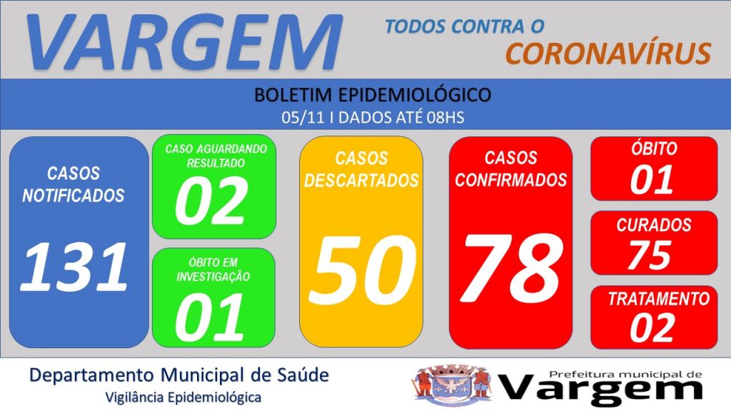 A Vigilância Epidemiológica da Prefeitura Municipal de Vargem confirmou no dia de hoje (05/11/2020), 01 (um) caso CONFIRMADO, 02 (dois) casos SUSPEITOS e 01 caso DESCARTADO e 01(um) caso CURADO de coronavírus no município.