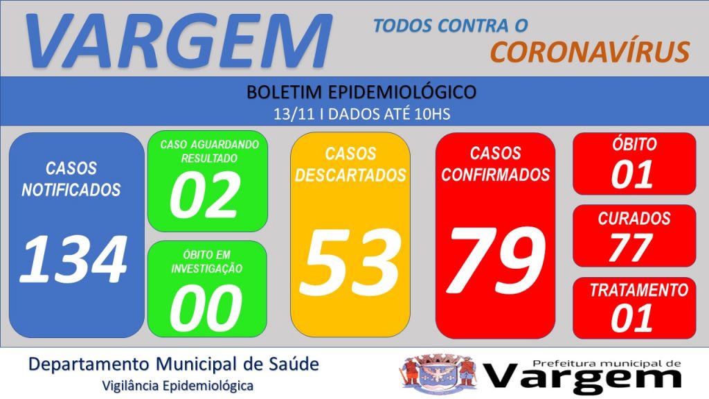 A Vigilância Epidemiológica da Prefeitura Municipal de Vargem confirmou no dia de hoje (13/11/2020), 01 (um) caso CONFIRMADO, 01 (um) caso DESCARTADO e 01 (um) caso SUSPEITO de coronavírus no município.