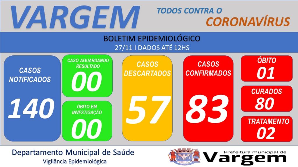 A Vigilância Epidemiológica da Prefeitura Municipal de Vargem confirmou no dia de hoje (27/11/2020), 03 (três) casos CURADOS de coronavírus no município.
