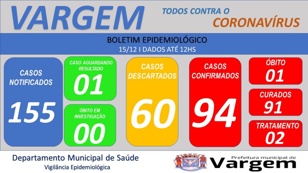 A Vigilância Epidemiológica da Prefeitura Municipal de Vargem confirmou no dia de hoje (15/12/2020), 01 (um) caso DESCARTADO de coronavírus no município.