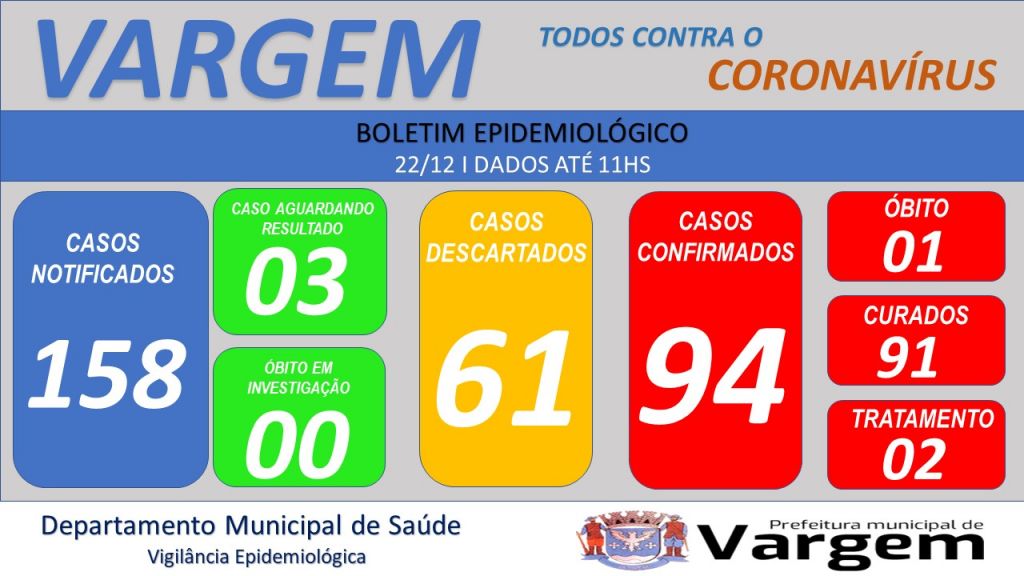 A Vigilância Epidemiológica da Prefeitura Municipal de Vargem confirmou no dia de hoje (22/12/2020), 03 (três) casos SUSEITOS de coronavírus no município.