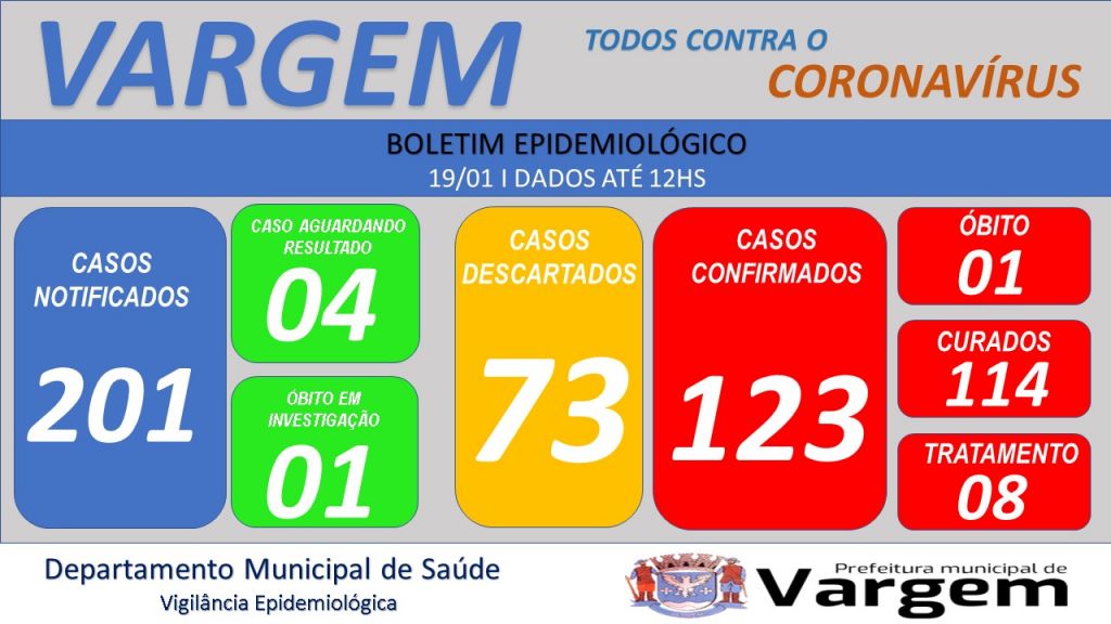 A Vigilância Epidemiológica da Prefeitura Municipal de Vargem confirmou no dia de hoje (19/01/2021), 01 (três) casos CONFIRMADOS e 03 (três) casos SUSPEITOS de coronavírus no município.