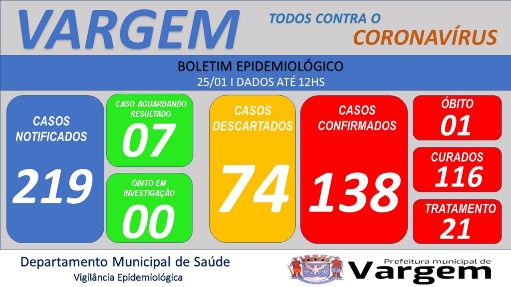 A Vigilância Epidemiológica da Prefeitura Municipal de Vargem confirmou no dia de hoje (25/01/2021), 03 (três) casos CONFIRMADOS, 01 (um) caso SUSPEITO e 02 (dois) casos CURADOS de coronavírus no município.