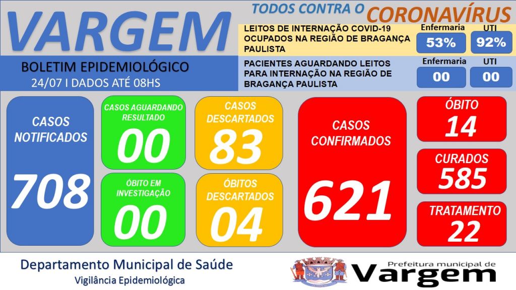 Vigilância Epidemiológica da Prefeitura Municipal de Vargem confirmou no dia de hoje (24/07/2021), 03 (três) casos CONFIRMADOS e 08 (oito) casos CURADOS de coronavírus no município.