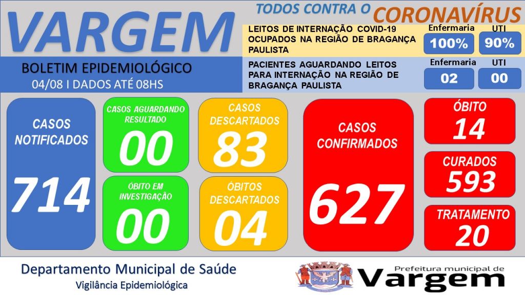 Vigilância Epidemiológica da Prefeitura Municipal de Vargem confirmou no dia de hoje (04/08/2021), 01 (um) caso CONFIRMADO e 03 (três) casos CURADOS de coronavírus no município.
