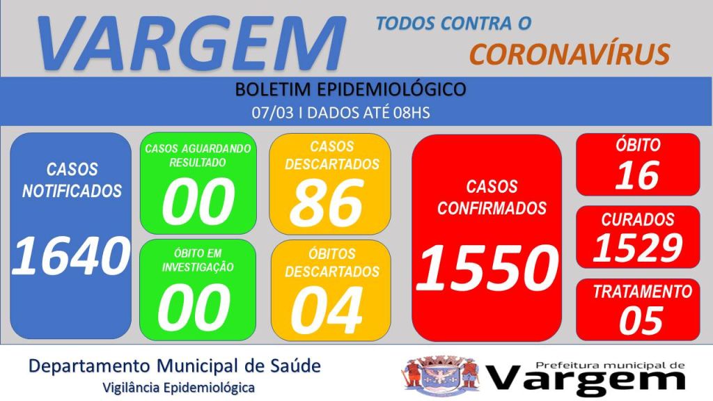 Vigilância Epidemiológica da Prefeitura Municipal de Vargem confirmou no dia de hoje (07/03/2022), 01 (um) caso CONFIRMADO e 03 (três) casos CURADOS de coronavírus no município.
