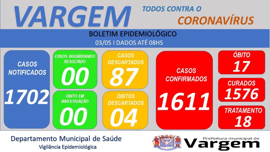 Vigilância Epidemiológica da Prefeitura Municipal de Vargem confirmou no dia de hoje (03/06/2022), 05 (cinco) casos CONFIRMADOS e 03 (três) casos CURADOS de coronavírus no município.