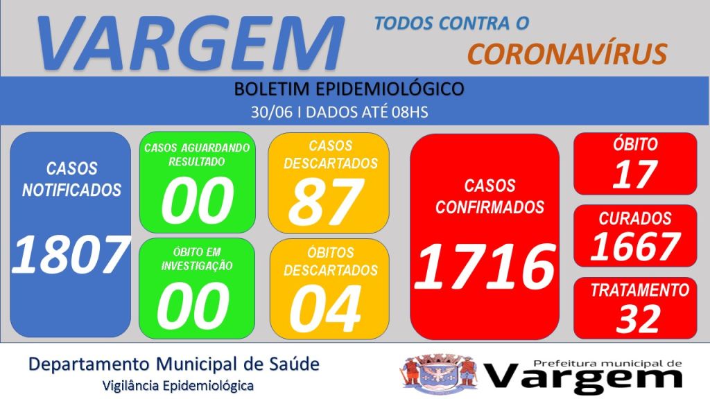 Vigilância Epidemiológica da Prefeitura Municipal de Vargem confirmou no dia de hoje (30/06/2022), 05 (cinco) casos CONFIRMADOS e 06 (seis) casos CURADOS de coronavírus no município.